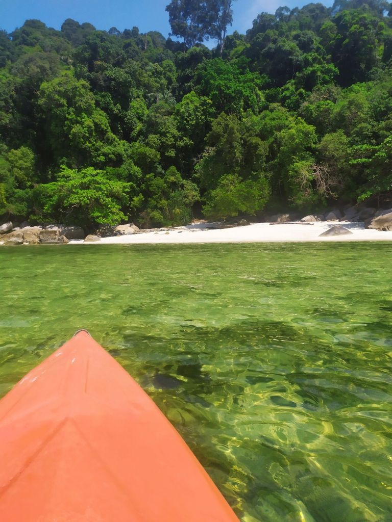 Un trayecto de varios autobuses me llevaría hasta Marang, un pueblito que recién amanecía cuando llegué. De allí partía el ferry hacia Pulau Kapas, una isla que acababa de abrir al turismo después de la temporada de lluvias y un destino de turismo local de playa que me regalaría días increíbles recorriendo sus playas de norte a sur. Lo primero fue comprar provisiones pues no hay tiendas en la isla y comer cada día en los restaurantes de los alojamientos podía salir algo caro. En el mercado local me abastecí de todo lo necesario y me dirigí al fast ferry en el que llegué a la isla surcando las olas literalmente y desembarcamos en plena playa con una escalera que se movía… ¡Toda una aventura! Lo segundo fue encontrar alojamiento a buen precio, y después de preguntar en varios sitios, me decidí por el camping a pie de playa que regentaba un chico muy amable donde pasé tres días y tres noches, compartiendo charlas y cenas con otros campistas y recorriendo los senderos que entre bosques y playas me llevarían a rincones salvajes y a playas desiertas.